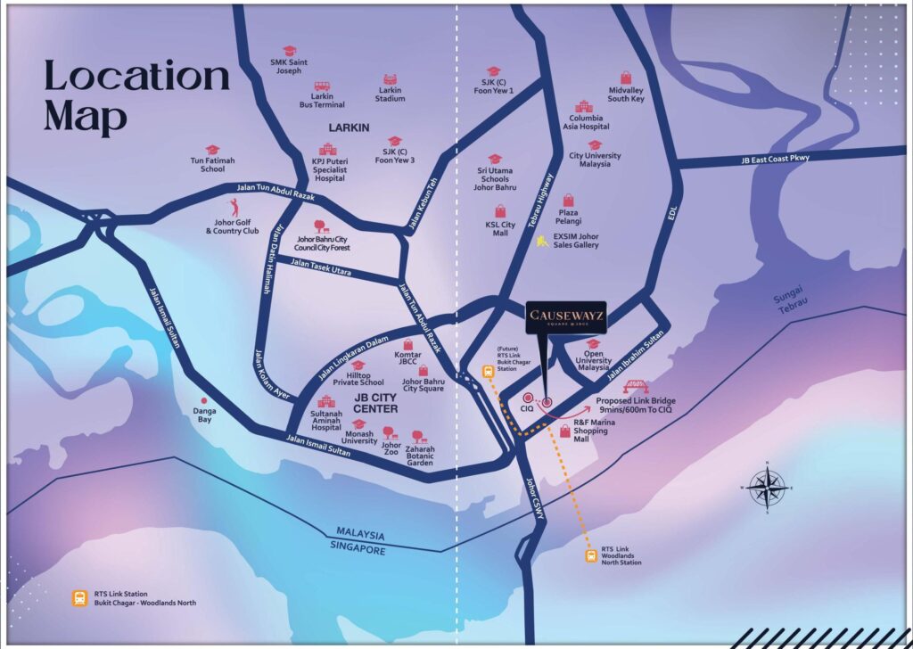 EXSIM Causewayz Square is ideally positioned in the heart of Johor Bahru City Centre (JBCC), just minutes from the CIQ station and upcoming RTS station, ensuring effortless connectivity to Singapore. Within walking distance to JB Sentral, major shopping destinations, and key transport hubs, the development offers exceptional convenience for both daily commuters and modern city living.